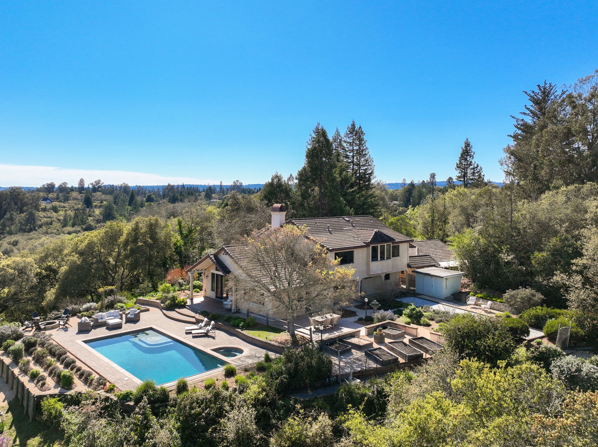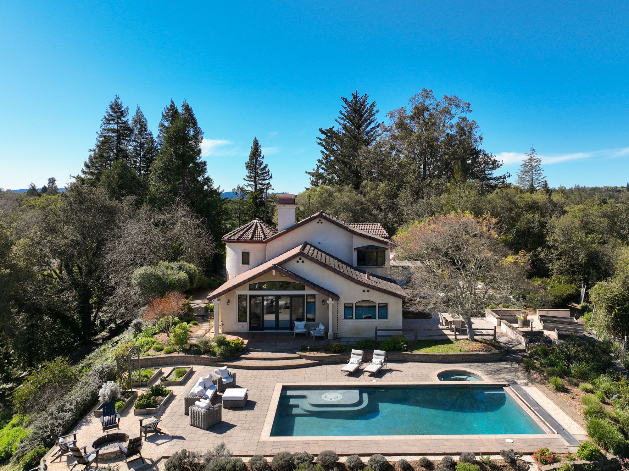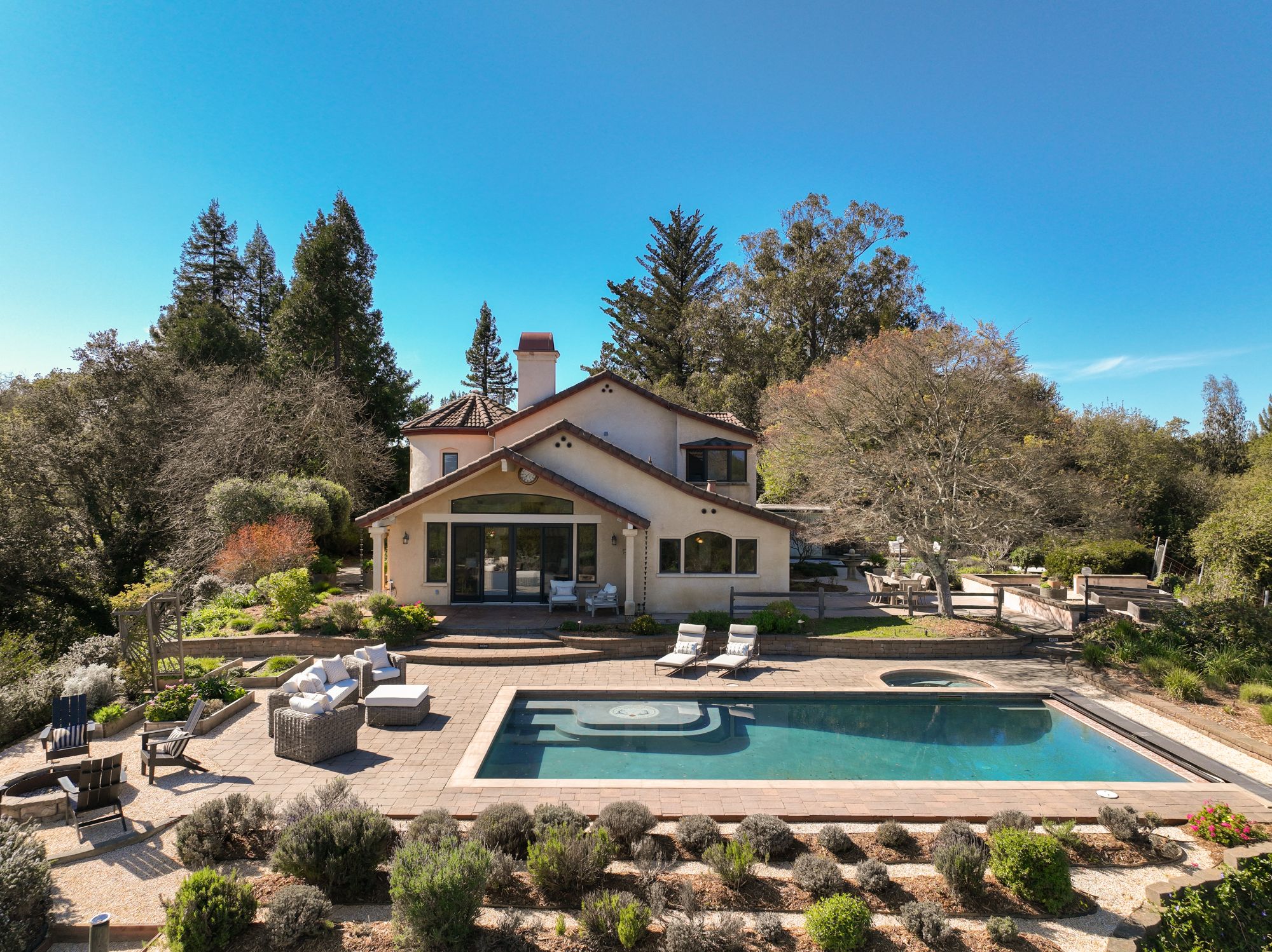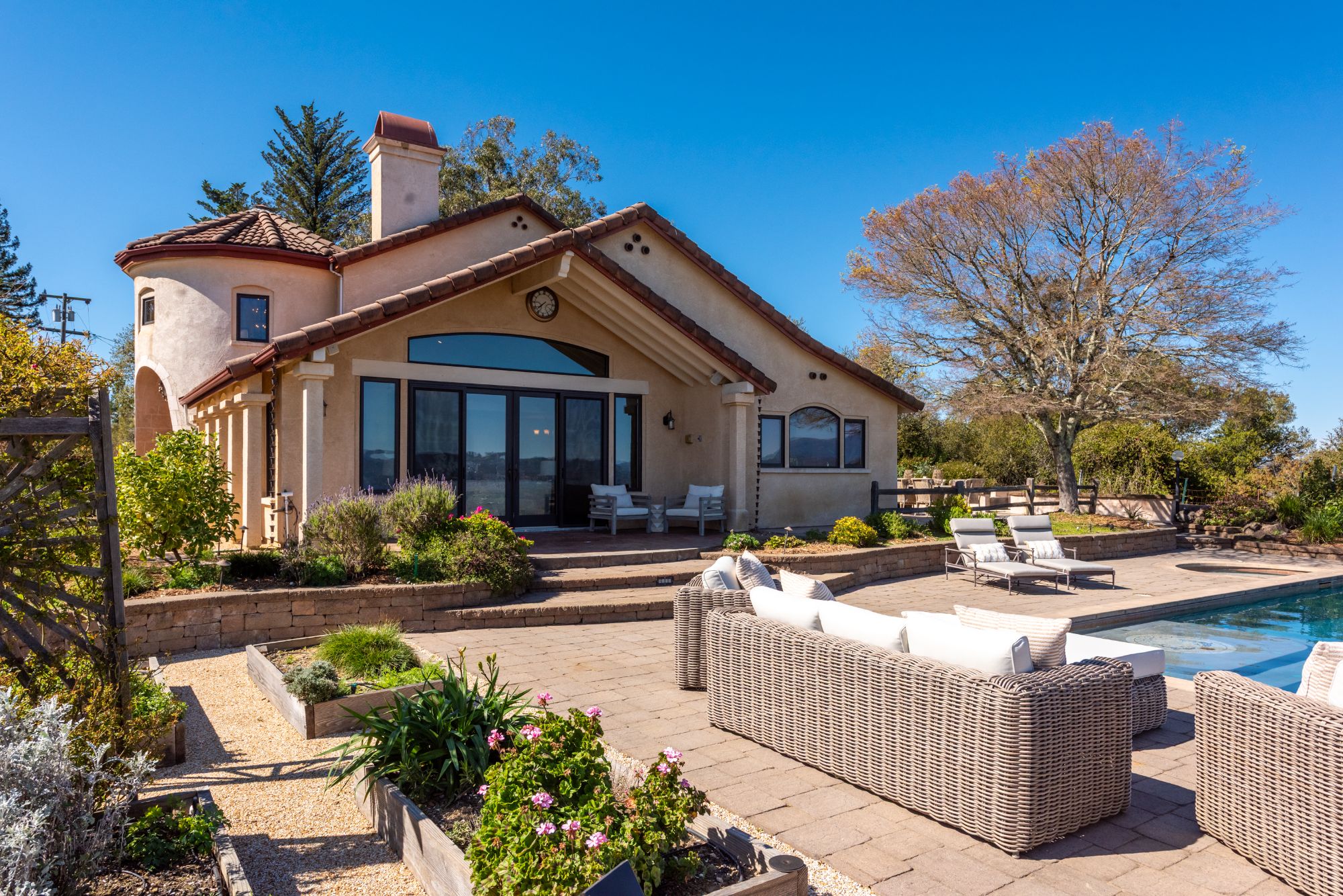 Inspired by the owner’s summer visits to the island of Majorca as a child, this Mediterranean farmhouse styled home is located on one of the most amazing spots in Sonoma County. This home was built just 22 years ago by Oso Construction and is a true masterpiece of home, serenity and sense of place.