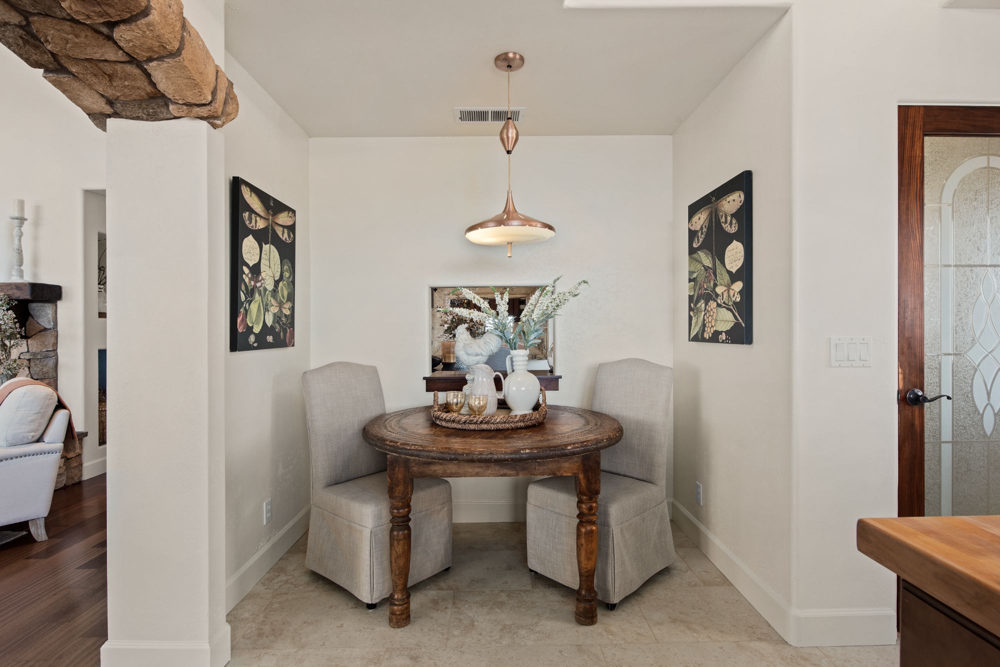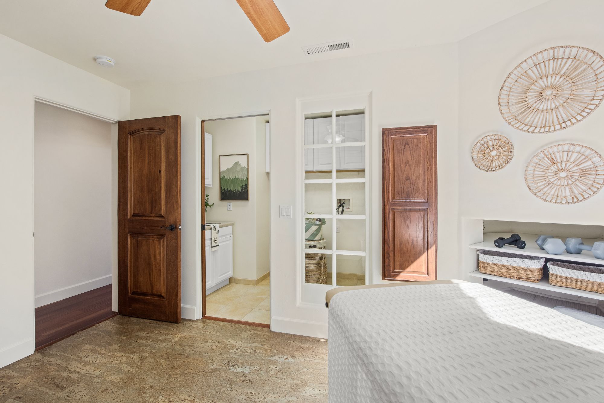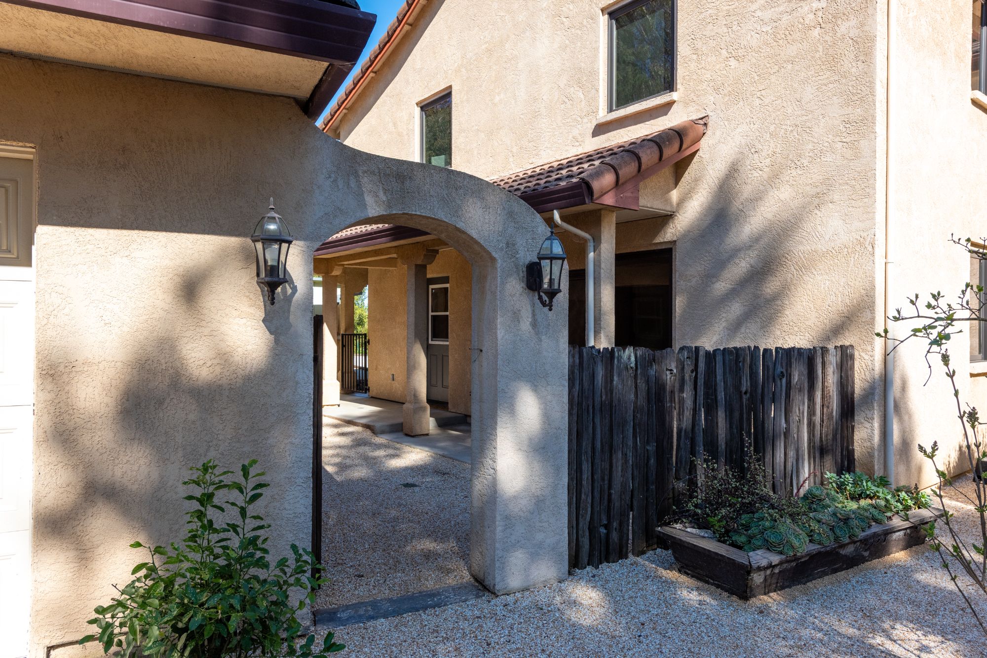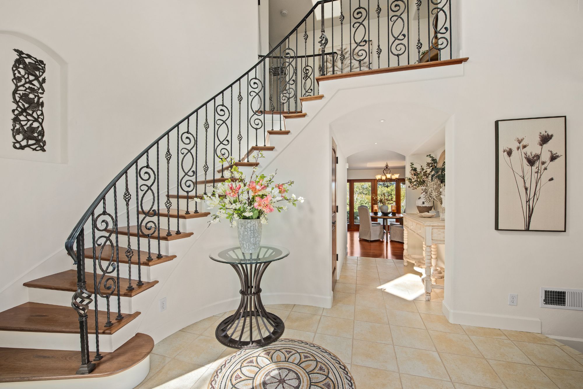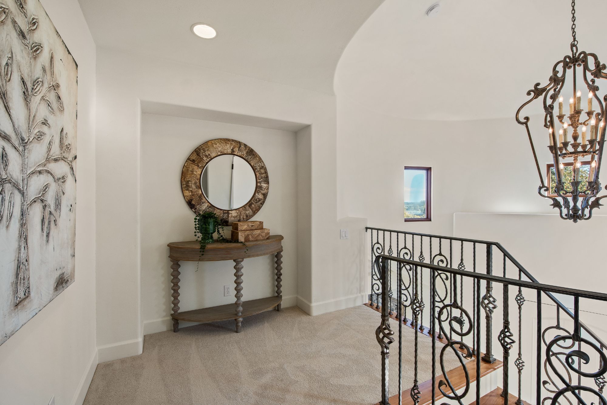 The arched entry opens to a curved staircase leading to the upper level which includes the primary suite and natural light fill bathroom with a fantastic soaking tub. No need for window coverings here. There are two additional spacious bedrooms and a second full bathroom.