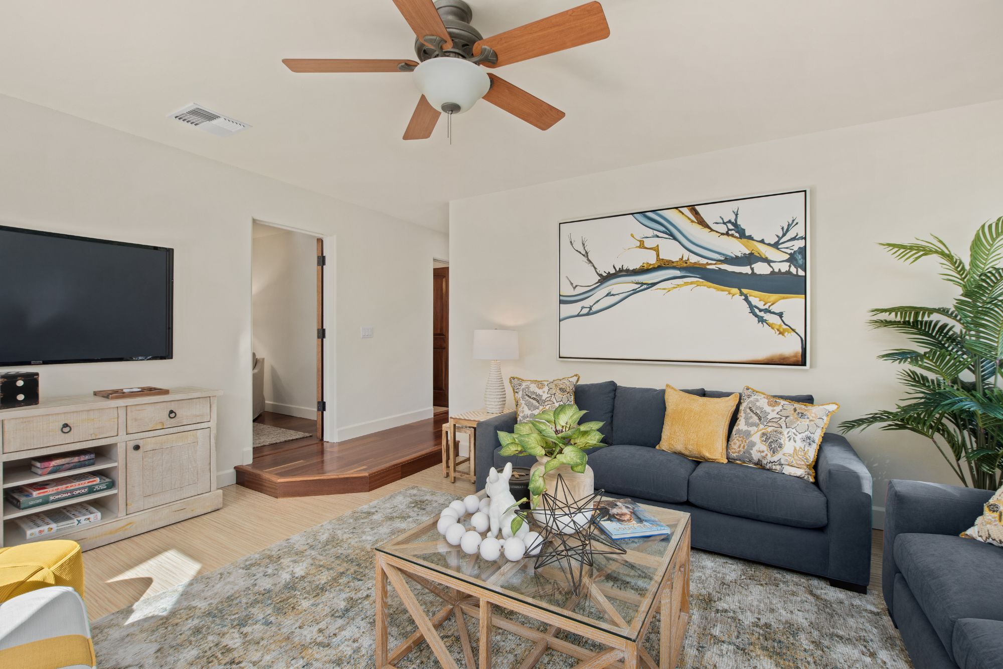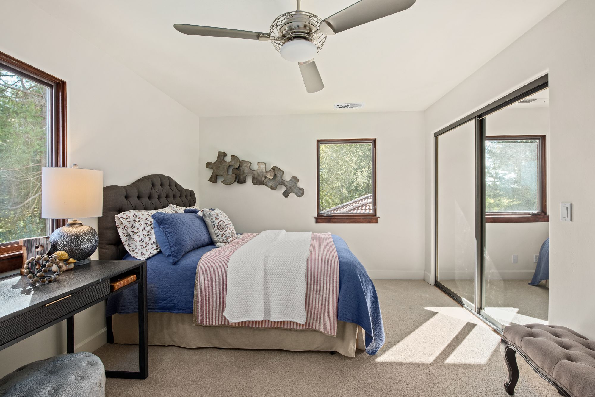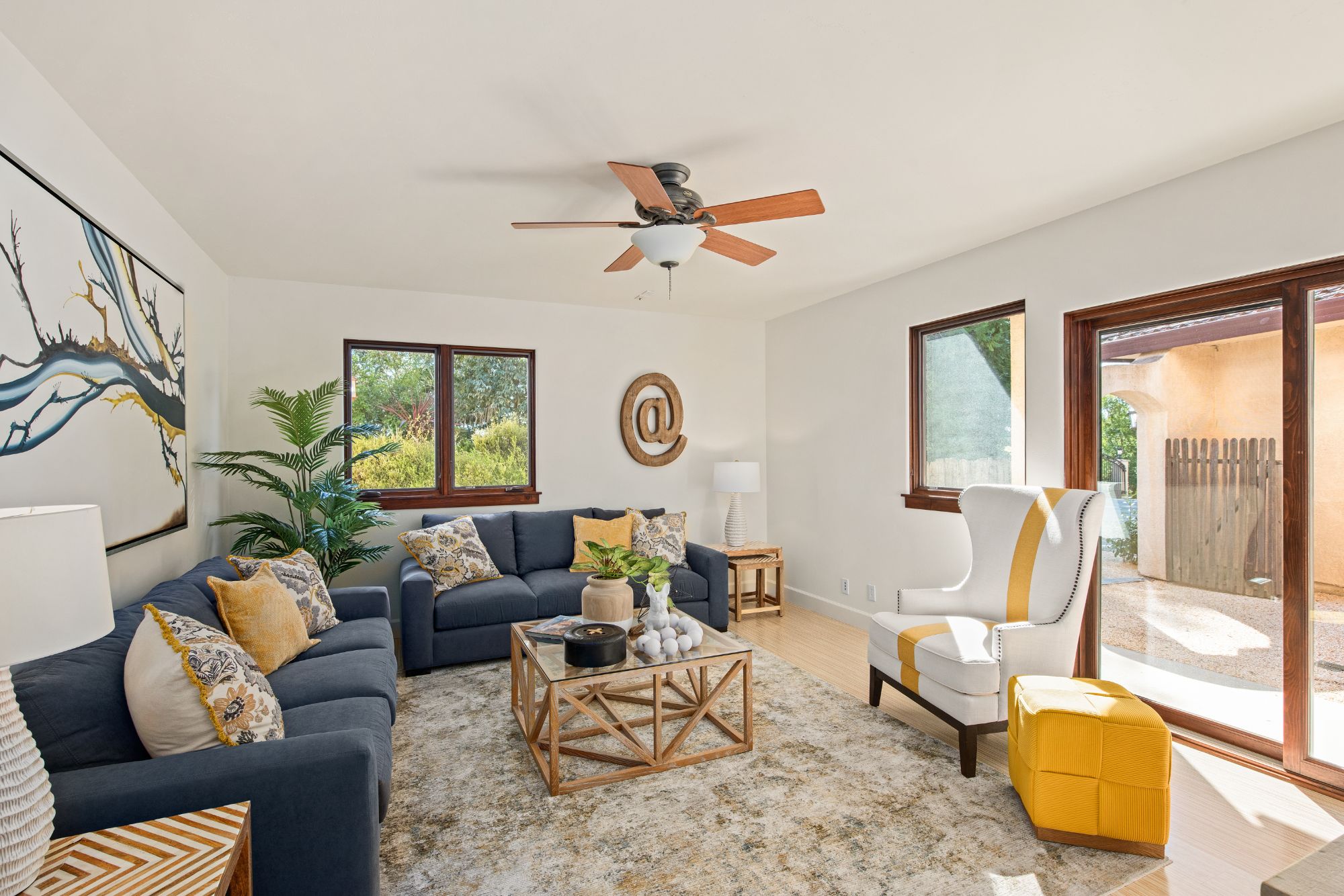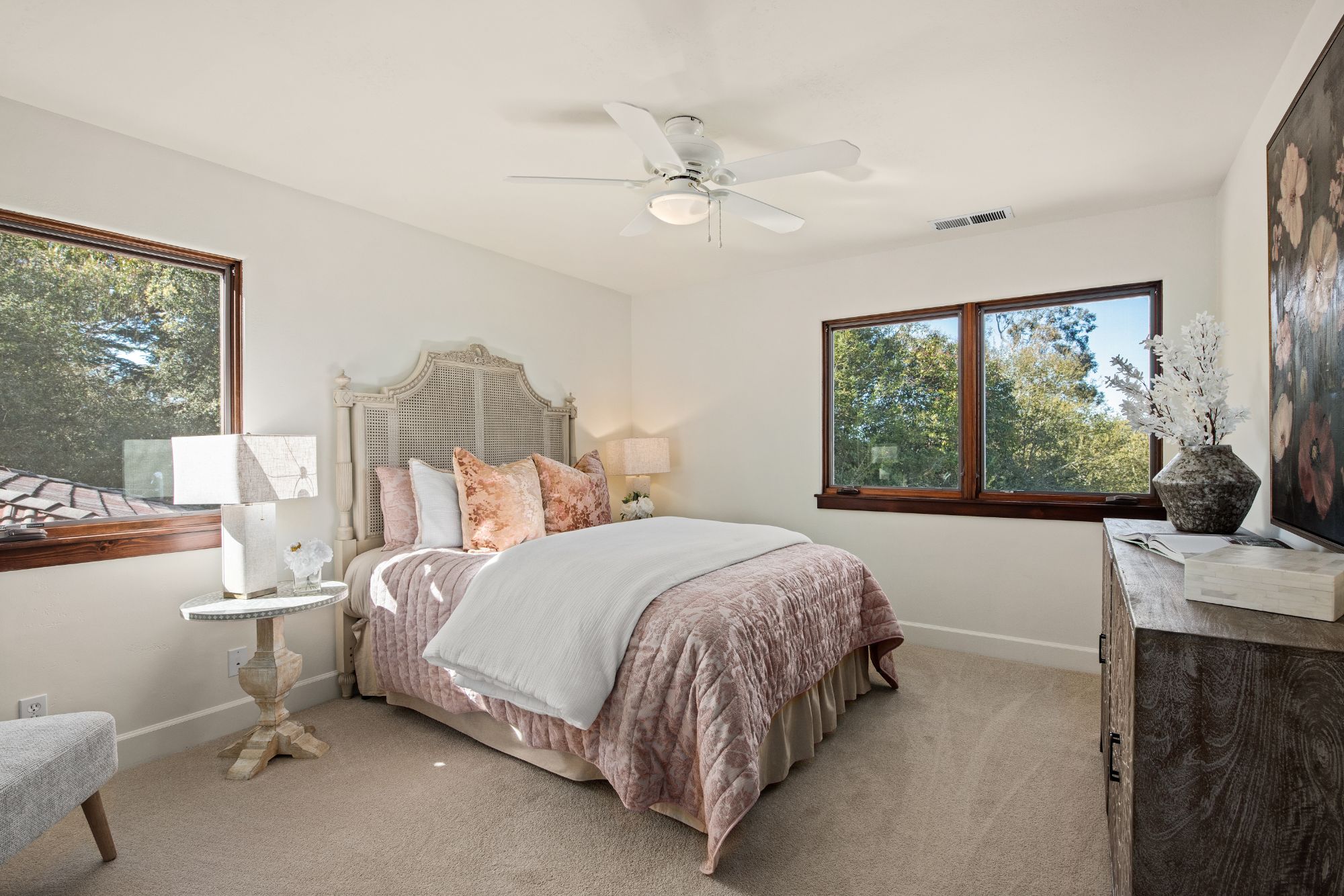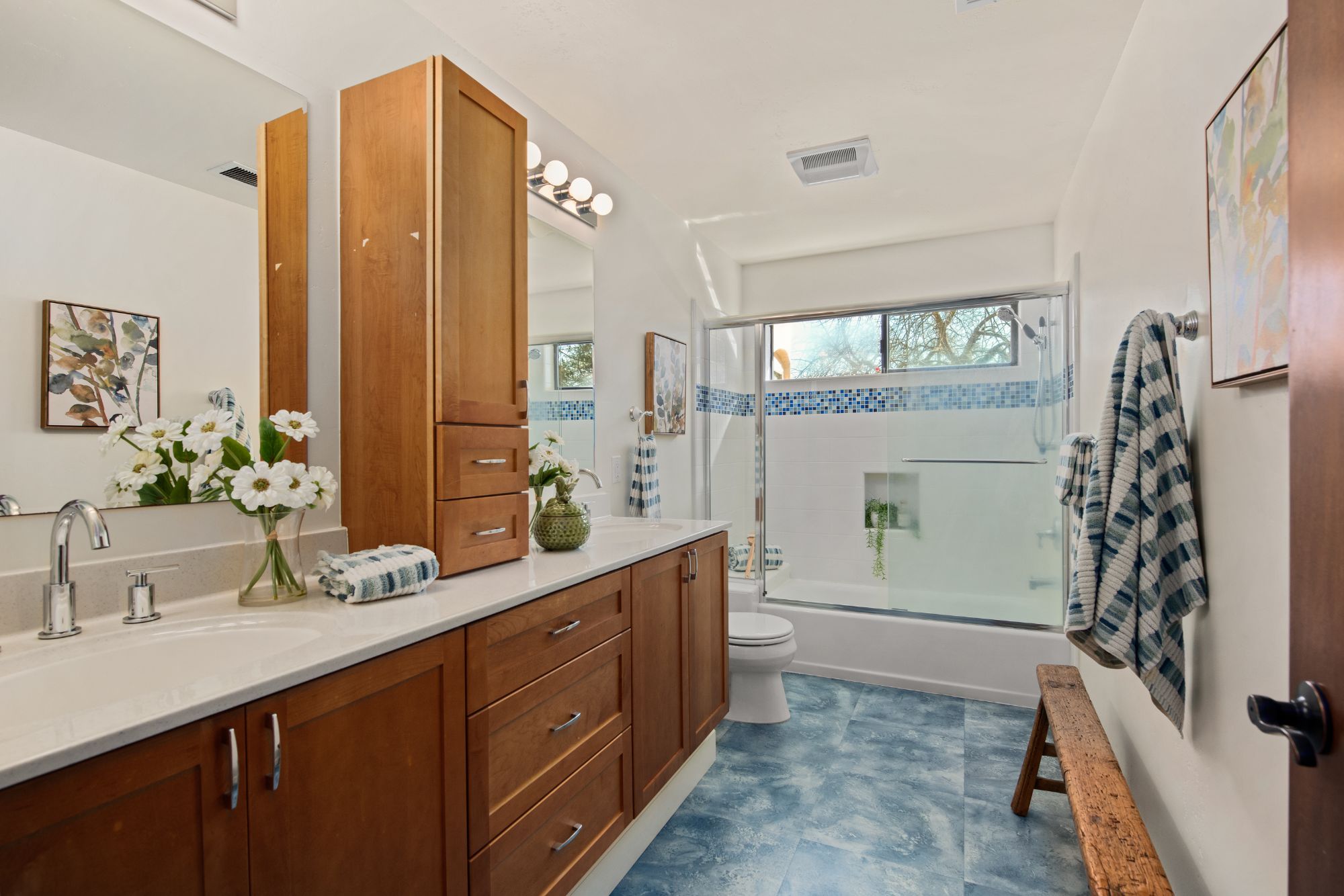 The arched entry opens to a curved staircase leading to the upper level which includes the primary suite and natural light fill bathroom with a fantastic soaking tub. No need for window coverings here. There are two additional spacious bedrooms and a second full bathroom.